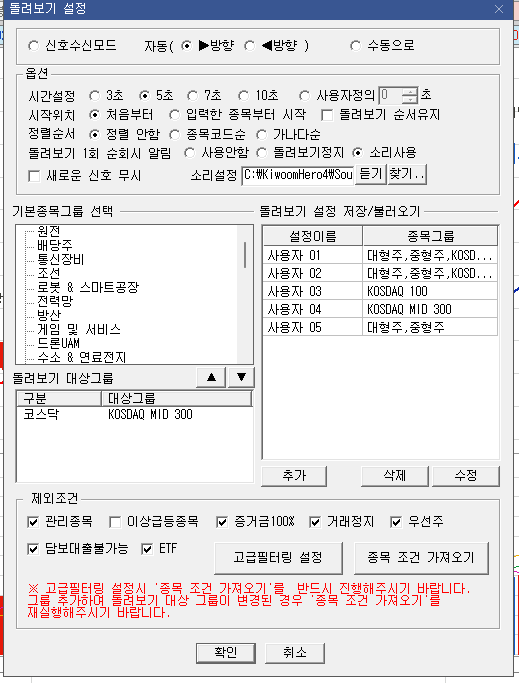 - 조건 검색: 수식관리자 사용. 예: '거래량 급증 종목' 검색.